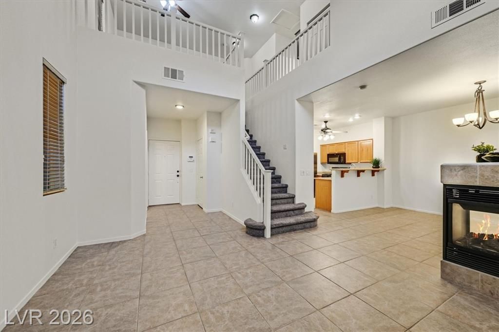 BEAUTIFUL HENDERSON TOWN HOME nestled against Beautiful MOUNTAINS! In desirable GATED community of VIEWS AT BLACK MOUNTAIN with wonderful amenities including pool and park. CAPTIVATING entry into home adorned with HIGH CEILINGS, NATURAL LIGHT and HILLSIDE VIEWS. OPEN FLOORPLAN with 3 WAY FIREPLACE surrounded by lovely living room and dining area. KITCHEN has Granite counters & eat-at breakfast bar. ALL APPLIANCES CONVEY. Powder bath, walk-in shelved closet & ATTACHED 2 CAR GARAGE entry downstairs. Upstairs has 2 large bedrooms, one being a double doored PRIMARY with its own BALCONY! Has a BIG WALK-IN CLOSET and an attached bathroom with 2 sinks, separate tub & shower. Other bedroom separate from primary next to a full hall bath. LARGE LOFT & Laundry closet upstairs. The private and cozy backyard is complete with a LARGE COVERED PATIO and easy care landscaping. Do not miss this one!